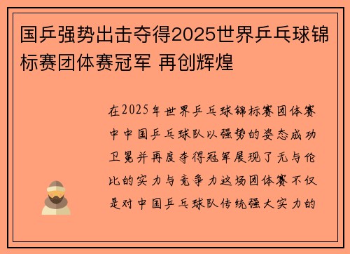在2025年世界乒乓球锦标赛团体赛中,中国乒乓球队以强势的姿态,成功卫冕并再度夺得冠军,展现了无与伦比的实力与竞争力。这场团体赛不仅是对中国乒乓球队传统强大实力的再次验证,更是国乒在世界乒坛地位的象征...
