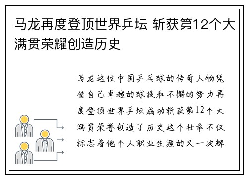 • 马龙再度登顶世界乒坛 斩获第12个大满贯荣耀创造历史