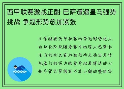 文章摘要:西甲联赛的争冠形势进入白热化阶段,随着赛季的深入,巴萨和皇马的对决愈加激烈,两支西班牙传统豪门的实力较量牵动着球迷的心弦。尽管巴萨拥有不容小觑的整体实力,但皇马在齐达内的带领下,逐渐找回了巅...