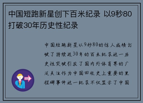 中国短跑新星以9秒80的惊人成绩打破了持续近30年的百米纪录,这一历史性突破引发了国内外体育界的广泛关注。作为中国田径史上重要的里程碑事件,这一纪录不仅显示了中国短跑选手在世界舞台上的崭露头角,也为中...