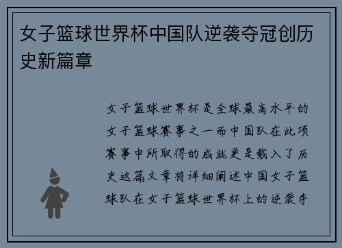女子篮球世界杯是全球最高水平的女子篮球赛事之一,而中国队在此项赛事中所取得的成就更是载入了历史。这篇文章将详细阐述中国女子篮球队在女子篮球世界杯上的逆袭夺冠,如何创造了历史新篇章。首先,我们将回顾中国...