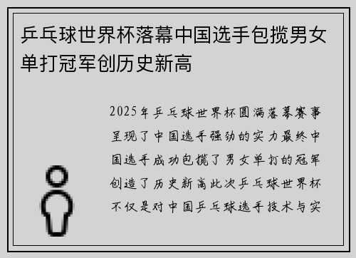 2025年乒乓球世界杯圆满落幕,赛事呈现了中国选手强劲的实力,最终,中国选手成功包揽了男女单打的冠军,创造了历史新高。此次乒乓球世界杯不仅是对中国乒乓球选手技术与实力的检验,也是对中国乒乓球发展历程的...