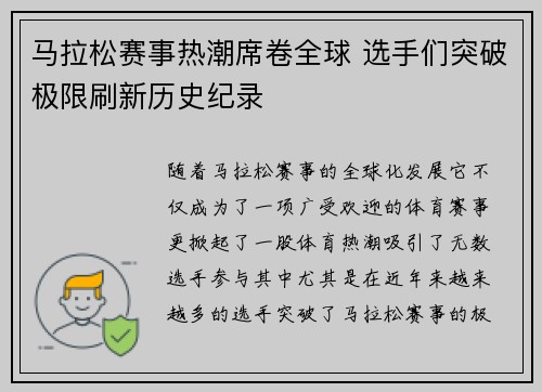 随着马拉松赛事的全球化发展,它不仅成为了一项广受欢迎的体育赛事,更掀起了一股体育热潮,吸引了无数选手参与其中。尤其是在近年来,越来越多的选手突破了马拉松赛事的极限,刷新了历史纪录,这一现象引发了全球范...