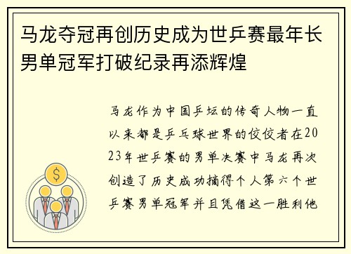 马龙作为中国乒坛的传奇人物,一直以来都是乒乓球世界的佼佼者。在2023年世乒赛的男单决赛中,马龙再次创造了历史,成功摘得个人第六个世乒赛男单冠军,并且凭借这一胜利,他也成为了历史上最年长的世乒赛男单冠...