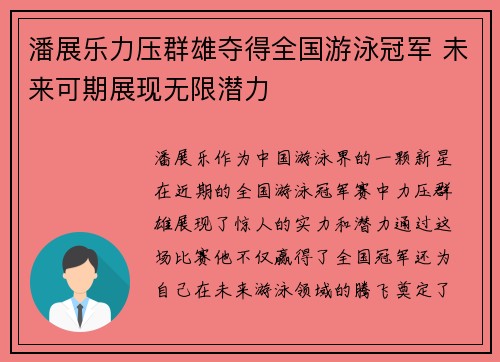 潘展乐,作为中国游泳界的一颗新星,在近期的全国游泳冠军赛中力压群雄,展现了惊人的实力和潜力。通过这场比赛,他不仅赢得了全国冠军,还为自己在未来游泳领域的腾飞奠定了坚实的基础。潘展乐的成功并非偶然,而是...