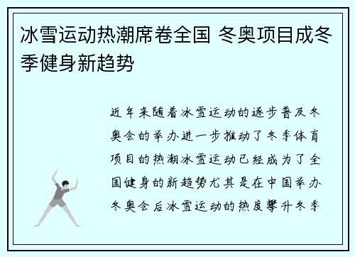 近年来,随着冰雪运动的逐步普及,冬奥会的举办进一步推动了冬季体育项目的热潮,冰雪运动已经成为了全国健身的新趋势。尤其是在中国举办冬奥会后,冰雪运动的热度攀升,冬季健身活动不仅吸引了大量运动爱好者参与,...