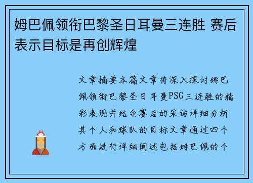 文章摘要:本篇文章将深入探讨姆巴佩领衔巴黎圣日耳曼(PSG)三连胜的精彩表现,并结合赛后的采访,详细分析其个人和球队的目标。文章通过四个方面进行详细阐述,包括姆巴佩的个人表现和他在球队中的核心地位,巴...