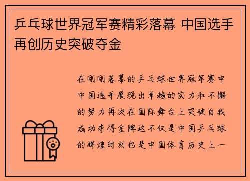 在刚刚落幕的乒乓球世界冠军赛中,中国选手展现出卓越的实力和不懈的努力,再次在国际舞台上突破自我,成功夺得金牌。这不仅是中国乒乓球的辉煌时刻,也是中国体育历史上一个新的里程碑。比赛过程中,来自中国的顶级...