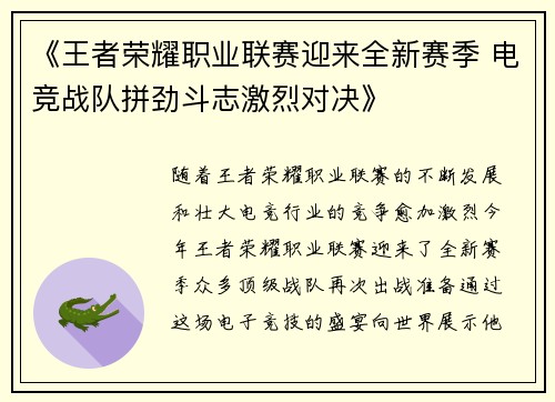 随着《王者荣耀》职业联赛的不断发展和壮大,电竞行业的竞争愈加激烈。今年,王者荣耀职业联赛迎来了全新赛季,众多顶级战队再次出战,准备通过这场电子竞技的盛宴向世界展示他们的实力和决心。全新的赛季不仅意味着...