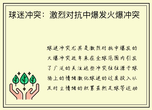 球迷冲突,尤其是激烈对抗中爆发的火爆冲突,近年来在全球范围内引发了广泛的关注。这些冲突往往源于球场上的情绪激化,球迷的过度投入以及对立情绪的积累。虽然足球等运动具有凝聚人心的力量,但一些球迷过度热衷,...