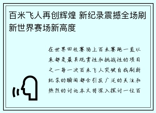 在世界田径赛场上,百米赛跑一直以来都是最具观赏性和挑战性的项目之一。每一次百米飞人突破自我、刷新纪录的瞬间,都会引发广泛的关注和热烈的讨论。本文将深入探讨一位百米飞人如何再次创造辉煌,震撼全场,刷新世...