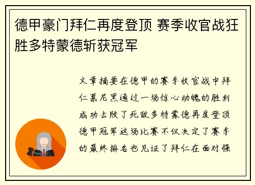 文章摘要:在德甲的赛季收官战中,拜仁慕尼黑通过一场惊心动魄的胜利,成功击败了死敌多特蒙德,再度登顶德甲冠军。这场比赛不仅决定了赛季的最终排名,也见证了拜仁在面对强劲对手时的统治力和稳定性。通过对整场比...