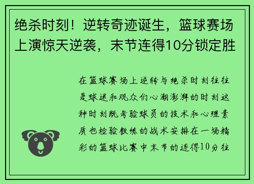 在篮球赛场上,逆转与绝杀时刻往往是球迷和观众们心潮澎湃的时刻。这种时刻既考验球员的技术和心理素质,也检验教练的战术安排。在一场精彩的篮球比赛中,末节的连得10分往往成为比赛的转折点,打破了对方的防线,...