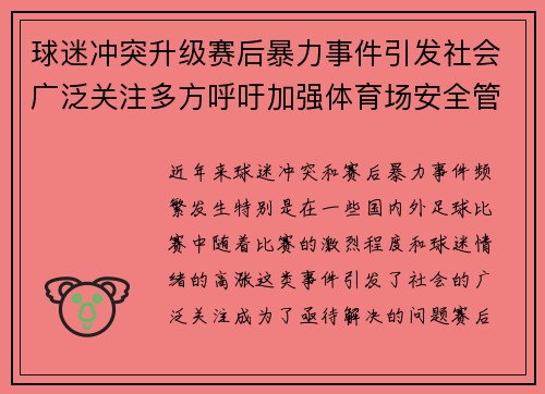 近年来,球迷冲突和赛后暴力事件频繁发生,特别是在一些国内外足球比赛中。随着比赛的激烈程度和球迷情绪的高涨,这类事件引发了社会的广泛关注,成为了亟待解决的问题。赛后暴力不仅影响了赛事的正常进行,也对社会...
