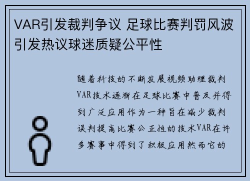 随着科技的不断发展,视频助理裁判(VAR)技术逐渐在足球比赛中普及并得到广泛应用。作为一种旨在减少裁判误判、提高比赛公正性的技术,VAR在许多赛事中得到了积极应用,然而它的引入也不可避免地引发了大量争...