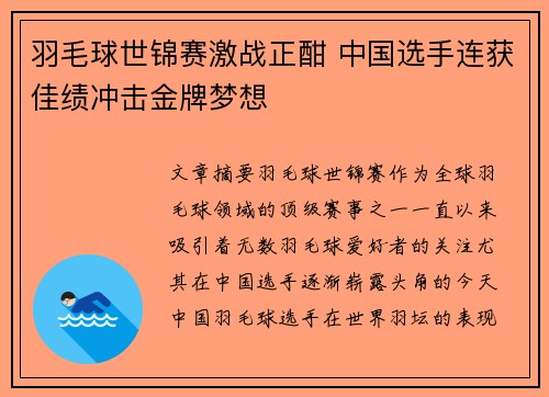 文章摘要:羽毛球世锦赛作为全球羽毛球领域的顶级赛事之一,一直以来吸引着无数羽毛球爱好者的关注。尤其在中国选手逐渐崭露头角的今天,中国羽毛球选手在世界羽坛的表现更是备受期待。近年来,中国选手的出色表现和...