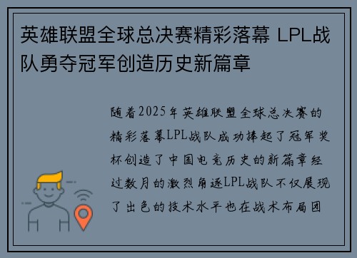 随着2025年英雄联盟全球总决赛的精彩落幕,LPL战队成功捧起了冠军奖杯,创造了中国电竞历史的新篇章。经过数月的激烈角逐,LPL战队不仅展现了出色的技术水平,也在战术布局、团队协作以及心理素质等方面取...