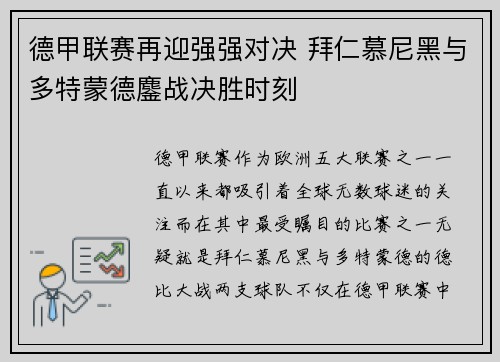 德甲联赛作为欧洲五大联赛之一,一直以来都吸引着全球无数球迷的关注。而在其中最受瞩目的比赛之一,无疑就是拜仁慕尼黑与多特蒙德的“德比大战”。两支球队不仅在德甲联赛中长期竞争榜首,而且彼此之间的较量更是充...