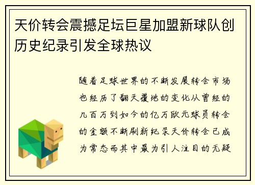 随着足球世界的不断发展,转会市场也经历了翻天覆地的变化。从曾经的几百万到如今的亿万欧元,球员转会的金额不断刷新纪录,天价转会已成为常态。而其中最为引人注目的,无疑是那些超越历史的巨星转会,这些球员的加...