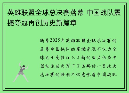 随着2025年英雄联盟全球总决赛的落幕,中国战队的震撼夺冠不仅为全球电子竞技注入了新的活力,也为中国电竞历史写下了光辉的一页。此次总决赛的胜利,不仅意味着中国战队在世界舞台上的实力再一次得到证明,也展...