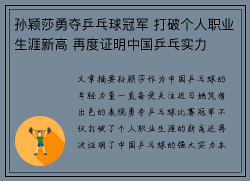 文章摘要:孙颖莎,作为中国乒乓球的年轻力量,一直备受关注。近日,她凭借出色的表现勇夺乒乓球比赛冠军,不仅打破了个人职业生涯的新高,还再次证明了中国乒乓球的强大实力。本文将从四个方面详细阐述孙颖莎的冠军...