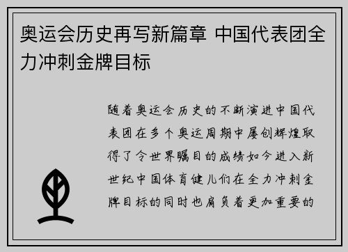 随着奥运会历史的不断演进,中国代表团在多个奥运周期中屡创辉煌,取得了令世界瞩目的成绩。如今,进入新世纪,中国体育健儿们在全力冲刺金牌目标的同时,也肩负着更加重要的历史使命。本文将从四个方面详细探讨中国...
