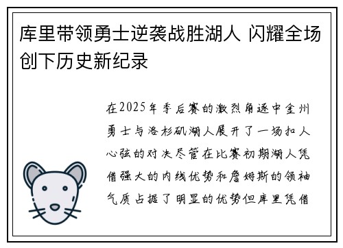 文章摘要:在2024-2025赛季中,斯蒂芬·库里领衔的金州勇士队以势不可挡的气势回归,强势登顶。库里凭借个人卓越的表现,打破多个纪录,引发了赛季的新高潮。他的三分球能力依旧恐怖,并且带领球队在激烈的...