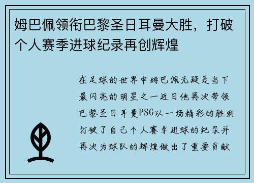 在足球的世界中,姆巴佩无疑是当下最闪亮的明星之一。近日,他再次带领巴黎圣日耳曼(PSG)以一场精彩的胜利,打破了自己个人赛季进球的纪录,并再次为球队的辉煌做出了重要贡献。本篇文章将详细探讨姆巴佩在这场...