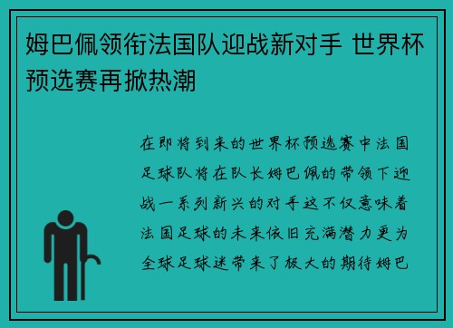 在即将到来的世界杯预选赛中,法国足球队将在队长姆巴佩的带领下迎战一系列新兴的对手。这不仅意味着法国足球的未来依旧充满潜力,更为全球足球迷带来了极大的期待。姆巴佩作为当今世界足坛的顶尖球员之一,他的领导...