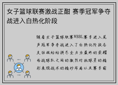 随着女子篮球联赛(WBBL)赛季进入尾声,冠军争夺战进入了白热化阶段。各支劲旅纷纷拼尽全力,为最终的荣耀而战。球队之间的激烈对抗、球员的精彩表现、战术的精妙布局,以及赛季前后的变数,使得这一届联赛充满...