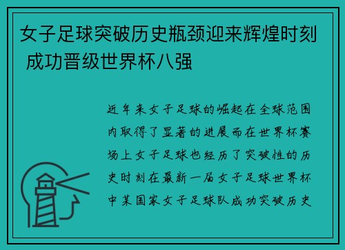 近年来,女子足球的崛起在全球范围内取得了显著的进展,而在世界杯赛场上,女子足球也经历了突破性的历史时刻。在最新一届女子足球世界杯中,某国家女子足球队成功突破历史瓶颈,迎来了辉煌时刻,成功晋级世界杯八强...