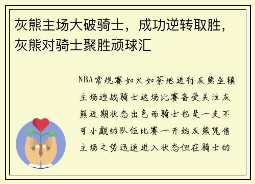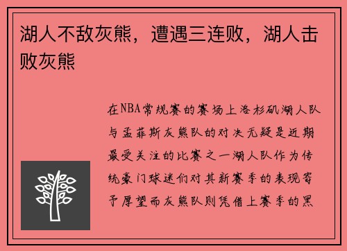 在NBA常规赛的赛场上,洛杉矶湖人队与孟菲斯灰熊队的对决无疑是近期最受关注的比赛之一。湖人队作为传统豪门,球迷们对其新赛季的表现寄予厚望,而灰熊队则凭借上赛季的黑马表现,逐渐崭露头角。这场备受瞩目的对...