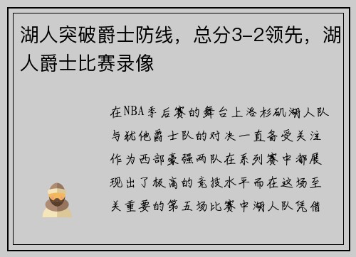 在NBA季后赛的舞台上,洛杉矶湖人队与犹他爵士队的对决一直备受关注。作为西部豪强,两队在系列赛中都展现出了极高的竞技水平。而在这场至关重要的第五场比赛中,湖人队凭借出色的防守和关键时刻的稳定发挥,以1...