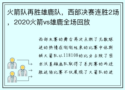 西部决赛的舞台再次点燃了无数球迷的热情。在刚刚结束的比赛中,休斯顿火箭队以118-108的比分击败了密尔沃基雄鹿队,取得了系列赛的两连胜。这场比赛不仅展现了火箭队的进攻火力,也体现了他们在关键时刻的阵...