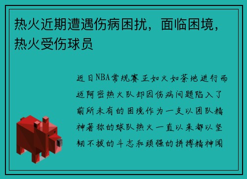近日,NBA常规赛正如火如荼地进行,而迈阿密热火队却因伤病问题陷入了前所未有的困境。作为一支以团队精神著称的球队,热火一直以来都以坚韧不拔的斗志和顽强的拼搏精神闻名。伤病的突如其来,让这支球队面临了巨...