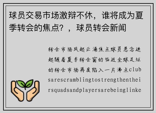 转会市场风起云涌,焦点球员悬念迭起 随着夏季转会窗的临近,全球足坛的转会市场再度陷入一片沸点。clubsarescramblingtostrengthentheirsquads,andplayersa...