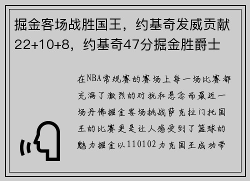 在NBA常规赛的赛场上,每一场比赛都充满了激烈的对抗和悬念。而最近一场丹佛掘金客场挑战萨克拉门托国王的比赛,更是让人感受到了篮球的魅力。掘金以110-102力克国王,成功带走胜利。这场比赛中,掘金当家...