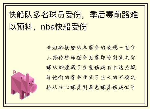 洛杉矶快船队本赛季的表现一直令人期待,然而在季后赛即将到来之际,球队却遭遇了多重伤病打击,这无疑给他们的赛季带来了巨大的不确定性。从核心球员到角色球员,伤病似乎成为了快船队无法回避的现实问题。 球队的...