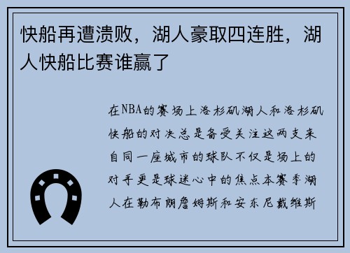 在NBA的赛场上,洛杉矶湖人和洛杉矶快船的对决总是备受关注。这两支来自同一座城市的球队,不仅是场上的对手,更是球迷心中的焦点。本赛季,湖人在勒布朗·詹姆斯和安东尼·戴维斯的带领下,展现出了极强的竞争力...