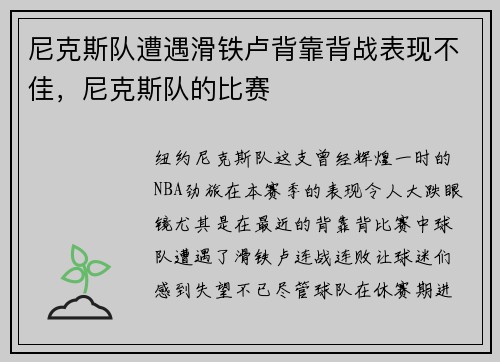 纽约尼克斯队,这支曾经辉煌一时的NBA劲旅,在本赛季的表现令人大跌眼镜。尤其是在最近的背靠背比赛中,球队遭遇了滑铁卢,连战连败,让球迷们感到失望不已。尽管球队在休赛期进行了阵容调整,但显然效果并不理想...