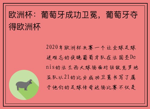 2020年欧洲杯决赛,一个让全球足球迷难忘的夜晚。葡萄牙队在法国圣Denis的法兰西大球场,面对劲敌克罗地亚队,以2-1的比分成功卫冕,书写了属于他们的足球传奇。这场比赛不仅是技术和战术的较量,更是意...
