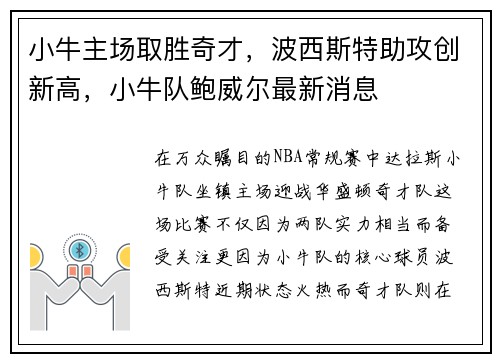 在万众瞩目的NBA常规赛中,达拉斯小牛队坐镇主场,迎战华盛顿奇才队。这场比赛不仅因为两队实力相当而备受关注,更因为小牛队的核心球员波西斯特近期状态火热,而奇才队则在争夺季后赛席位的关键阶段急需一场胜利...