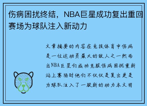 文章摘要的内容:在竞技体育中,伤病是一位运动员最大的敌人之一。然而,当NBA巨星们成功克服伤病困扰,重新站上赛场时,他们不仅仅是复出,更是为球队注入了一股新的动力。本文将从多个角度详细探讨伤病困扰的终...