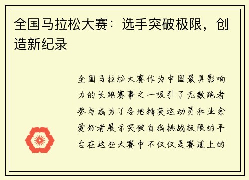 全国马拉松大赛作为中国最具影响力的长跑赛事之一,吸引了无数跑者参与,成为了各地精英运动员和业余爱好者展示突破自我、挑战极限的平台。在这些大赛中,不仅仅是赛道上的激烈竞争,更有无数选手在不同的条件下,打...