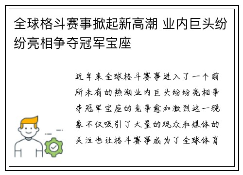 近年来,全球格斗赛事进入了一个前所未有的热潮,业内巨头纷纷亮相,争夺冠军宝座的竞争愈加激烈。这一现象不仅吸引了大量的观众和媒体的关注,也让格斗赛事成为了全球体育文化的一个重要组成部分。从赛事的举办规模...