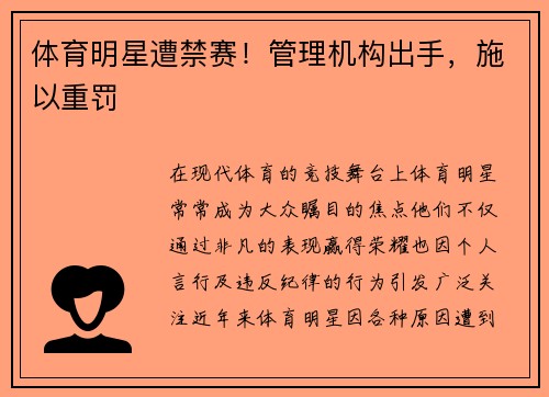 在现代体育的竞技舞台上,体育明星常常成为大众瞩目的焦点。他们不仅通过非凡的表现赢得荣耀,也因个人言行及违反纪律的行为引发广泛关注。近年来,体育明星因各种原因遭到禁赛和重罚的事件屡屡发生,成为了全球体育...