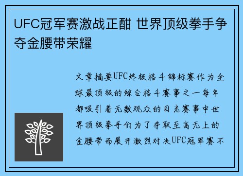 文章摘要:UFC(终极格斗锦标赛)作为全球最顶级的综合格斗赛事之一,每年都吸引着无数观众的目光。赛事中,世界顶级拳手们为了夺取至高无上的金腰带而展开激烈对决。UFC冠军赛不仅仅是一场场激烈的肉搏战,更...