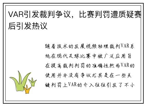 随着技术的发展,视频助理裁判(VAR)系统在现代足球比赛中被广泛应用,旨在提高裁判判罚的准确性。然而,VAR的使用并非没有争议,尤其是在一些关键判罚上,VAR的介入往往引发了不小的讨论与质疑。随着VA...