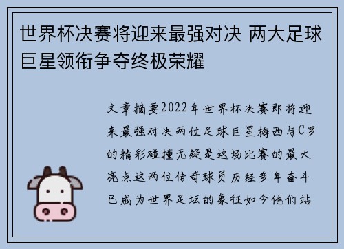 文章摘要:2022年世界杯决赛即将迎来最强对决,两位足球巨星梅西与C罗的精彩碰撞,无疑是这场比赛的最大亮点。这两位传奇球员历经多年奋斗,已成为世界足坛的象征。如今,他们站在同一起跑线上,为了争夺终极荣...