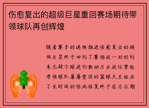 随着赛季的逐渐推进,伤愈复出的超级巨星终于回到了赛场,这一刻的到来无疑令球迷们激动万分。这位曾经带领球队屡屡登顶的篮球天王,经历了长时间的伤病恢复,终于在万众期待中再次披上战袍。本文将深入探讨伤愈复出...